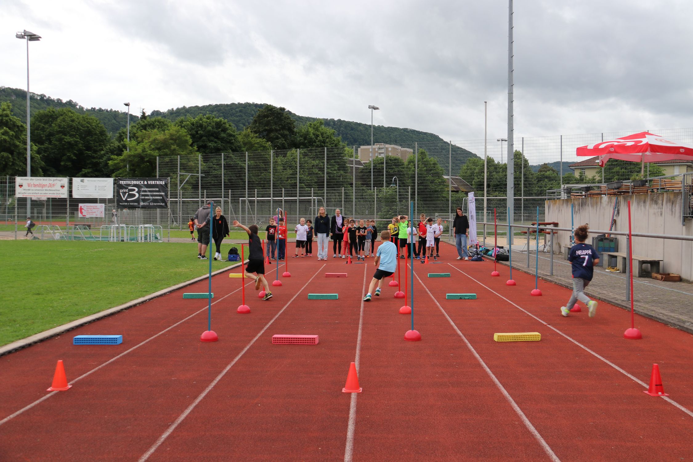 In Geislingen am 05.06. durften insgesamt 11 Klassen mit 250 Schüler:innen die acht Grundschule-trifft-Kinderleichtathletik-Stationen ausprobieren und neue Bewegungsformen kennenlernen. Die Kinder waren begeistert und motiviert und wurden zusätzlich durch die Topathletin der TG Geislingen angespornt. Lara Kneifel zeigte den Kindern, wie schnell man über die Hürden laufen kann, und wurde mit riesigem Applaus und lauten Jubel-Schreien belohnt.